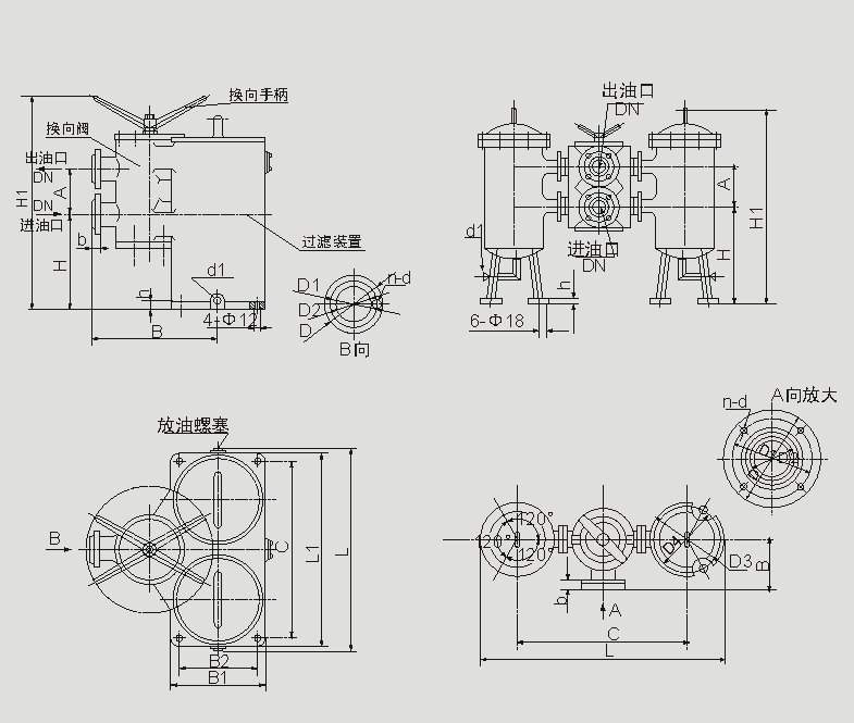 双筒网式过滤器(SLQ型,JB2302-78)一、概述产品适用于公称压力为0.6MPa的稀油润滑系统中,用以过滤污垢杂质,提高润滑油的清洁度,小型的为整体式,较大的为组合式,分别由二组过滤筒和一个三位六通换向阀组成,工作时一组过滤筒工作,另一组过滤筒备用,可实现不停车切换过滤筒,达到循环润滑不间断工作的目的。