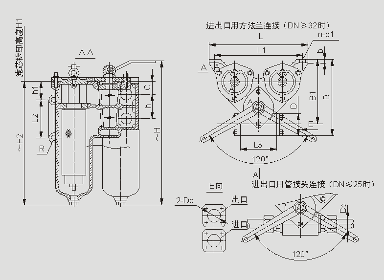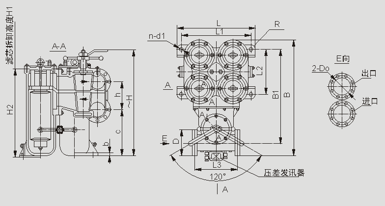 | 法兰标准GB573-65:DN150-3组滤芯组件、DN200-4组滤芯组件:压差发讯器为选配件。 |