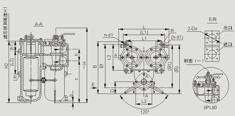 | 安装形式:X-为下置式,C-为侧置式, ()内尺寸为侧置式,压差发讯器为选配件,SPL80提升机构见附图(一) |