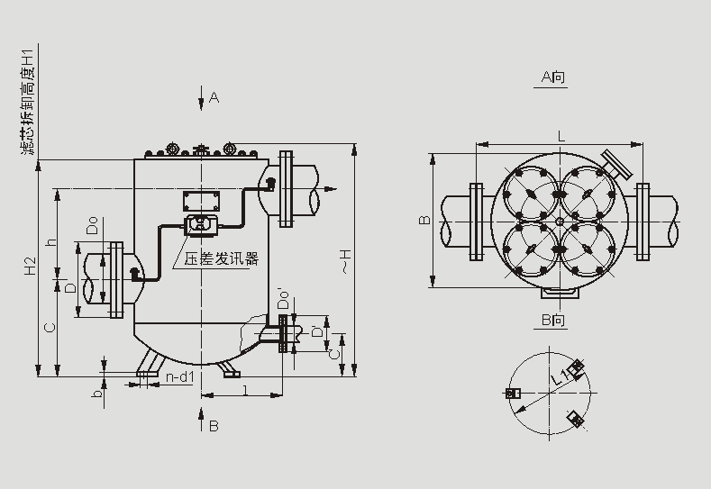 | 法兰标准:GB573-65(可根据需要确定):DN100、150-3组滤芯组件;DN200-4组滤芯组件;压差发讯器为选配件。 |